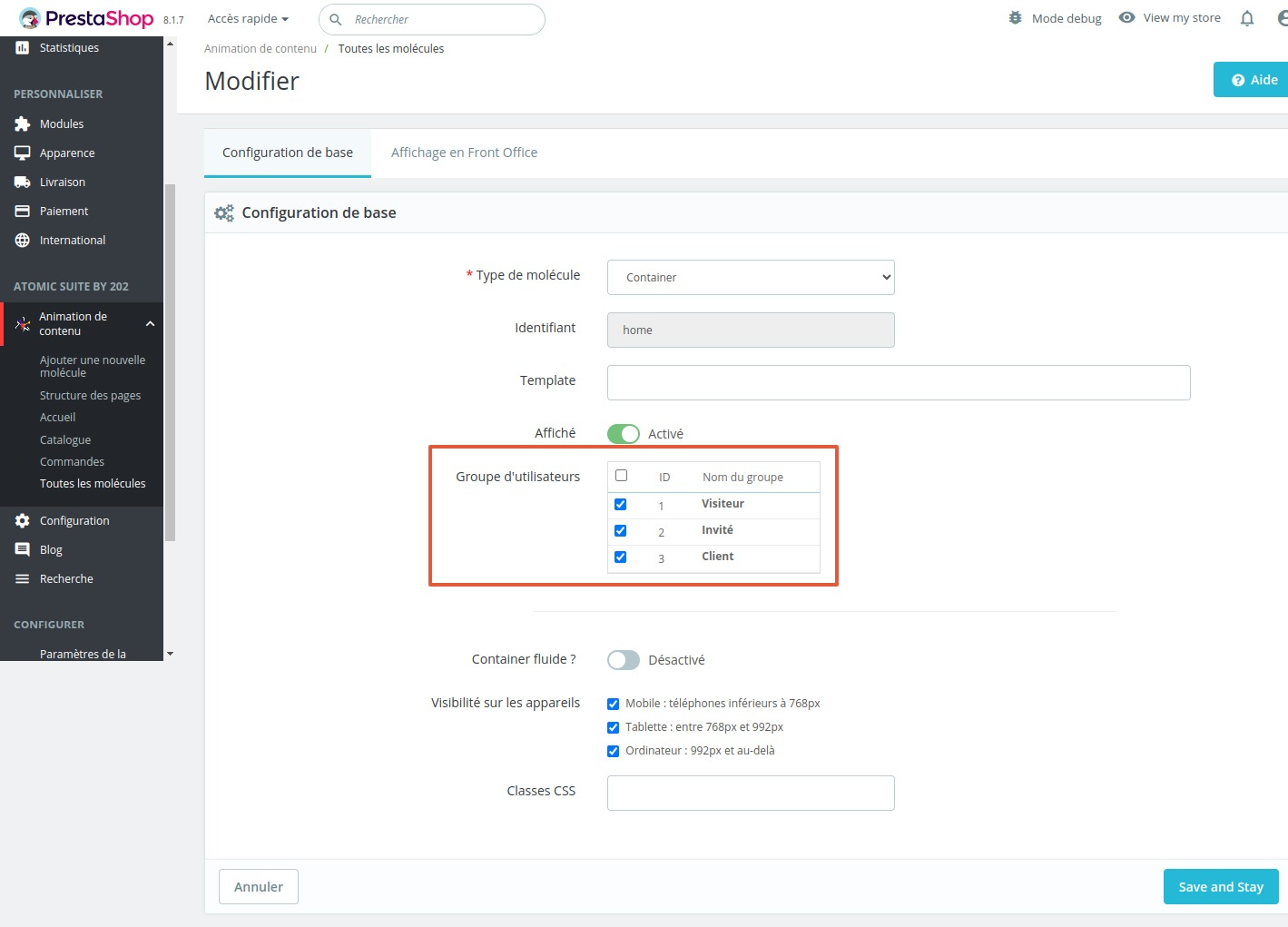 Pendant la configuration de la molécule, vous pourrez choisir quels groupes de clients pourront voir la molécule créée.